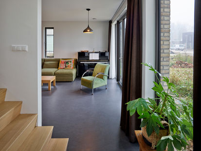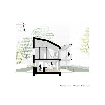Baksteen tegenover hout, kubistisch naast oprijzende dakvormen; dit opvallende woonhuis verenigt tegenstellingen tot een samenhangend geheel. Tussen de twee volumes verbindt een fraaie houten trap beneden met boven. De deling in volumes volgt de deling in het programma. In het houten volume een eetkeuken en kinderkamers met hoogslapers erboven. In het bakstenen deel beneden een woonkamer en de ouderslaapkamer boven. Zo vormen de tegenstellingen niet alleen plastisch, maar ook programmatisch tezamen een expressief en origineel woonhuis.